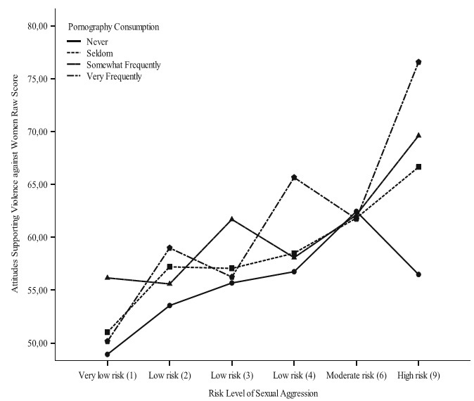 Résultats de l’étude de Malamuth 2010. En ordonnées : ASV. En abscisse : niveau de risque. Les différentes courbes correspondent à différents niveaux de consommation de pornographie