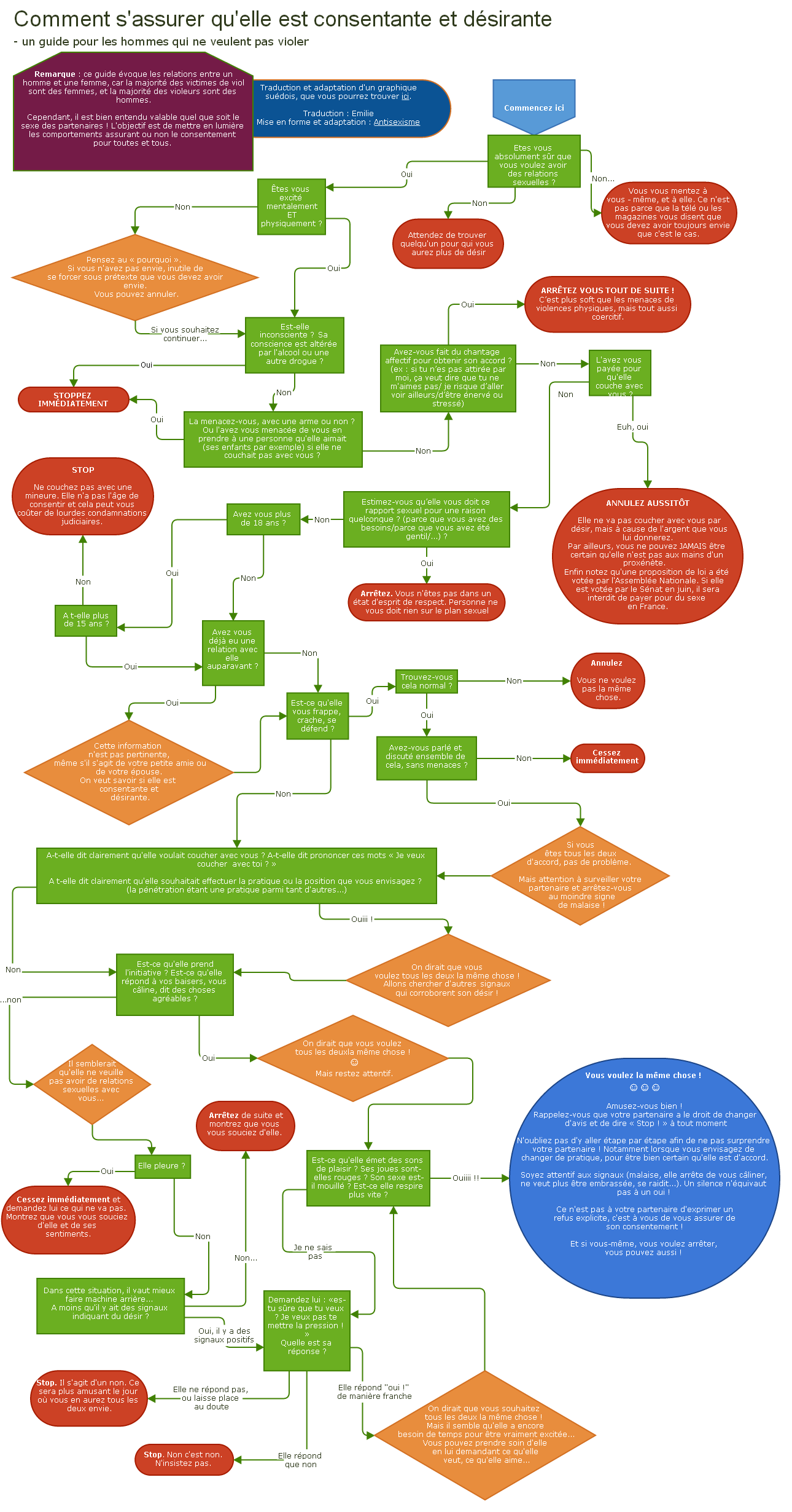 Ce diagramme pose des questions sur les actes des hommes (et sur, de manière plus général, les actes de celles et ceux qui initient des rapports sexuels). Il les responsabilise puisqu’il les oblige à répondre. C’est pour cela que je trouve qu’il est excellent. Je vous invite à le partager autant que possible, afin de renverser la perspective dans l’esprit des gens. Ce que j’apprécie aussi dans ce graphique, c’est qu’il demande à la personne elle-même s’il est certaine qu’elle désire avoir un rapport sexuel.